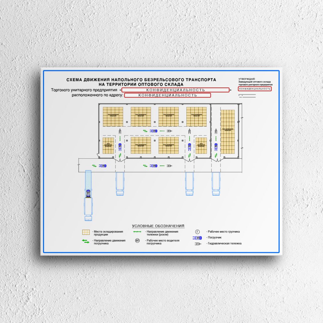 Движение напольного безрельсового транспорта по территории организации должно осуществляться в соответствии со схемой движения транспортных средств, устанавливаемой на видных местах, в том числе перед въездом на территорию организации, в производственных помещениях, других местах интенсивного движения транспортных средств, и регулироваться дорожными знаками.